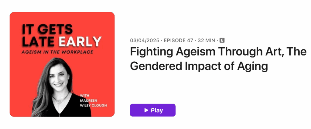 Dive deeper into how art challenges age-based stereotypes and their gendered dimensions on the podcast It Gets Late Early with Maureen Wiley Clough. This illuminating conversation highlights What About Age? and the broader movement to transform how we view aging.